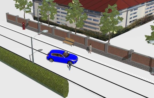Mit einem einzigen Klick bietet AnalyzerPro eine 3D-Darstellung des rekonstruierten Unfalls. Besonders hervorzuheben ist, wie einfach typische, die Sicht behindernde Objekte wie Häuser, Sträucher oder Böschungen dargestellt werden können.
